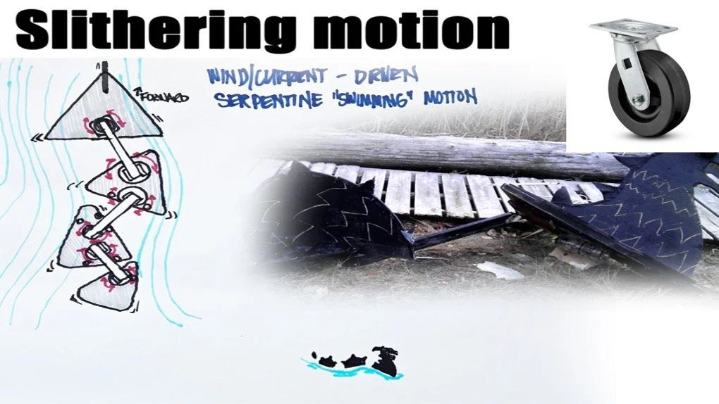 In order for the Monster to move in a serpentine slithering motion with the wind and current, I designed a linking system similar to railway cars - each piece was connected to the next with a 2x4 fixed on one side and attached on the other by a wheel caster. When the wind/current turned the head section in a certain direction, the following hump section would turn as railcars do when they turn on a curve. The second hump and finally the tail would follow this same motion. The resulting would be a slithering, serpentine motion that from a distance gave the illusion that the Monster was indeed swimming out in the creek.