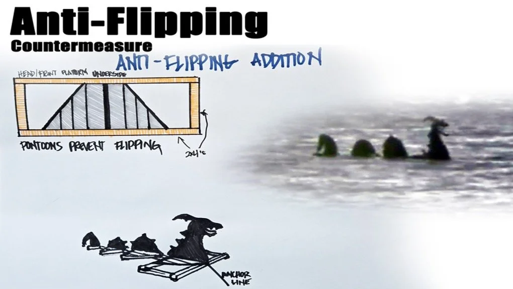 Because of the triangular platforms it floated upon, it would be susceptible to flipping. To counter this, I simply fashioned rectangular pontoons out of 2x4s and attached it to the head’s platform. This slowed the serpentine motion somewhat, but it kept the Monster from turning over.